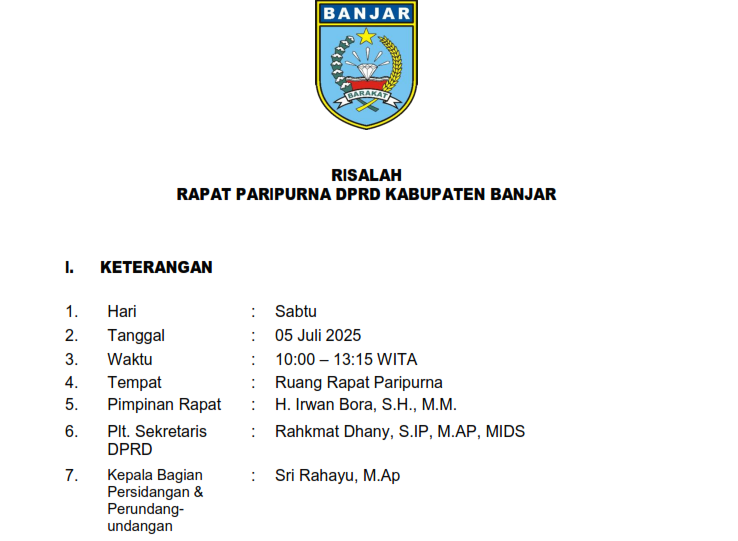 Risalah Rapat Paripurna DPRD Kabupaten Banjar tentang Pendapat Akhir Fraksi-Fraksi DPRD terhadap Raperda tentang RPJMD Tahun 2025-2029, Perubahan APBD TA 2025, Pertanggungjawaban Pelaksanaan APBD TA 2024 serta Pengambilan Keputusan Terhadap Raperda tentang RPJMD Tahun 2025-2029 dan Perubahan APBD TA 2025